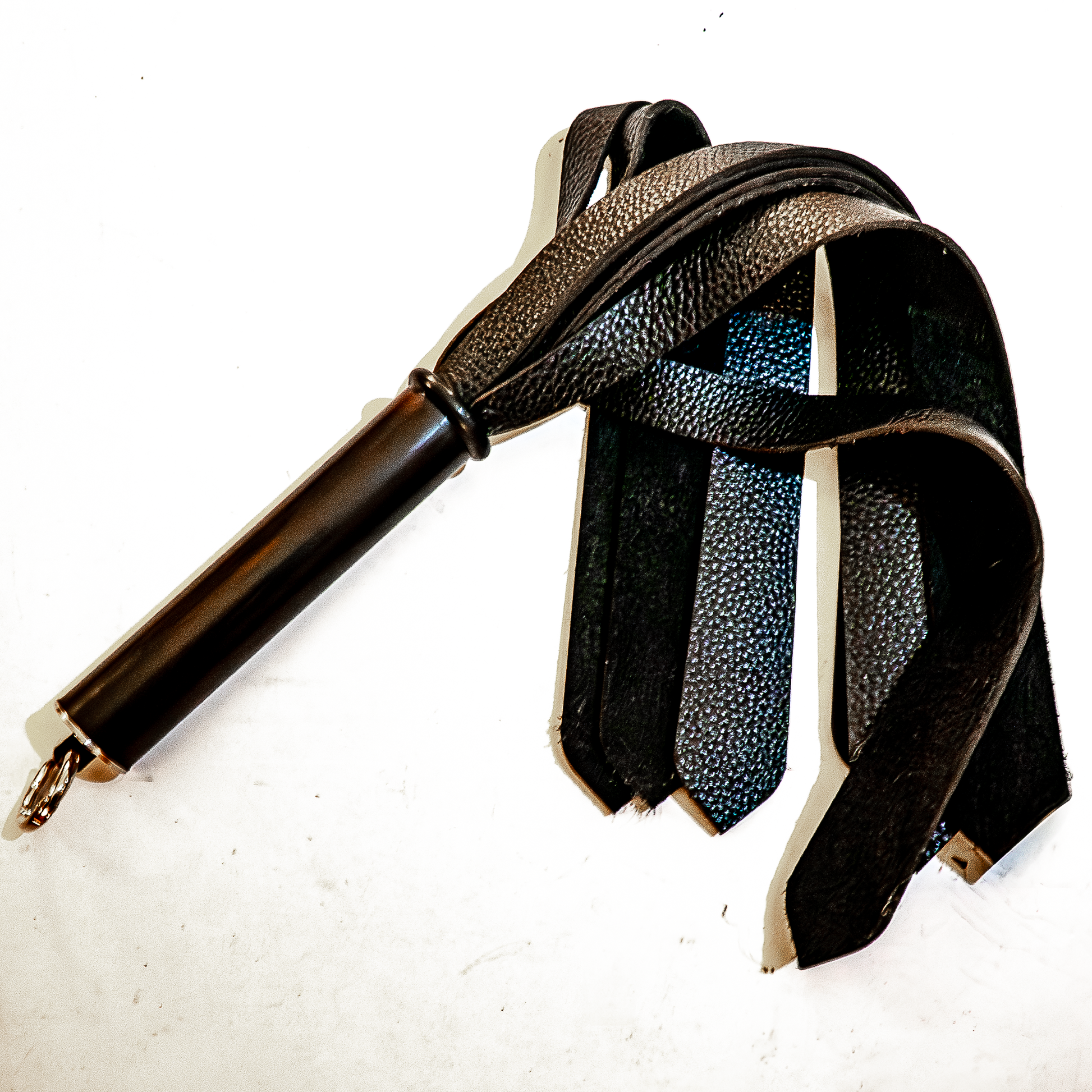 Flogger im Handtaschenformat mit (je nach Stärke des Leders) 10-12 Strängen aus dicken und anschmiegsam weichen schwarzen Lederstreifen. Die Streifen werden zur Spitze hin breiter und sind dort, wo sie die Haut treffen, ca. 3cm breit. Einfach, um mehr Ledervolumen und -gewicht in den Griff montiert zu bekommen.
