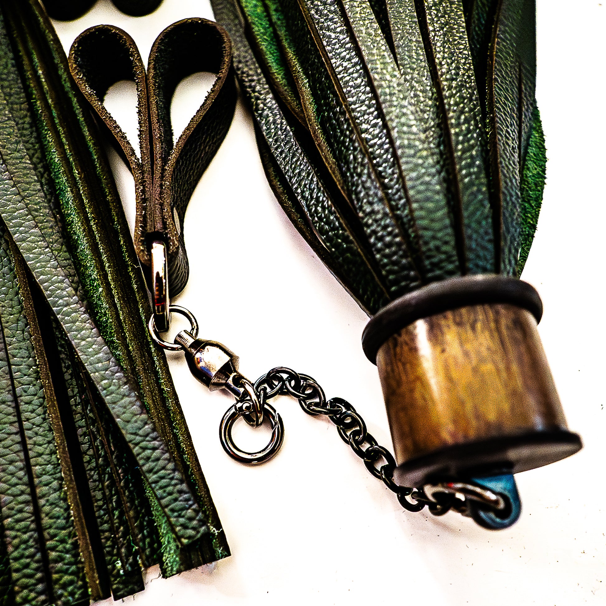 Die Fingerschlaufen aus weichem Leder sind mittels einem doppelt kugelgelagerten Wirbel (Drehgelenk) - super leichtgängig und nicht kaputt zu kriegen - und einer kurzen Edelstahlkette per Karabinerring an den Floggern befestigt. Die Kette oder auch die gesamte Mechanik ist abnehmbar, um die Stücke auch als Handflogger benutzen zu können.
